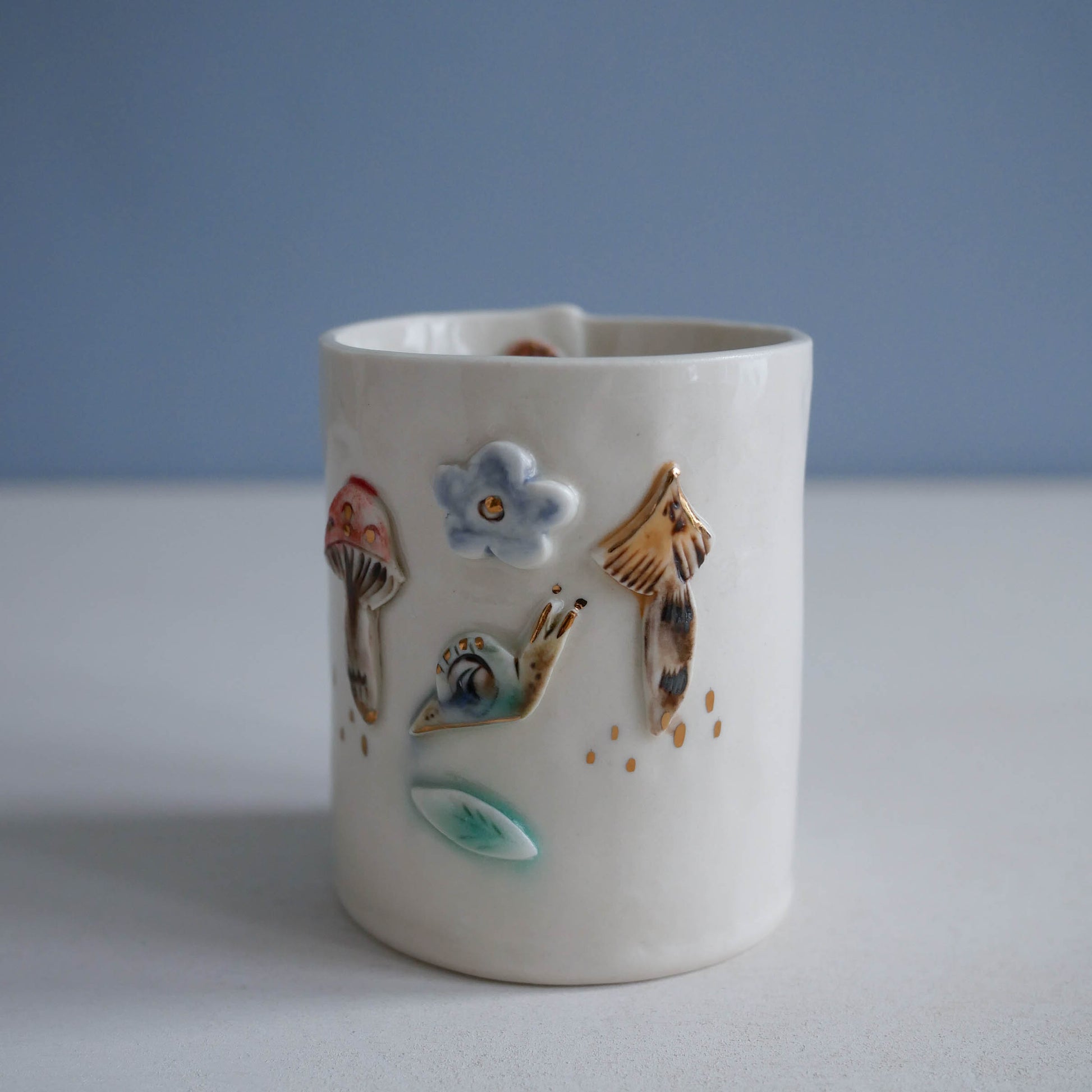 Sweet sippers. Handbuilt porcelain cup with applique designs. Hand formed, hand painted.