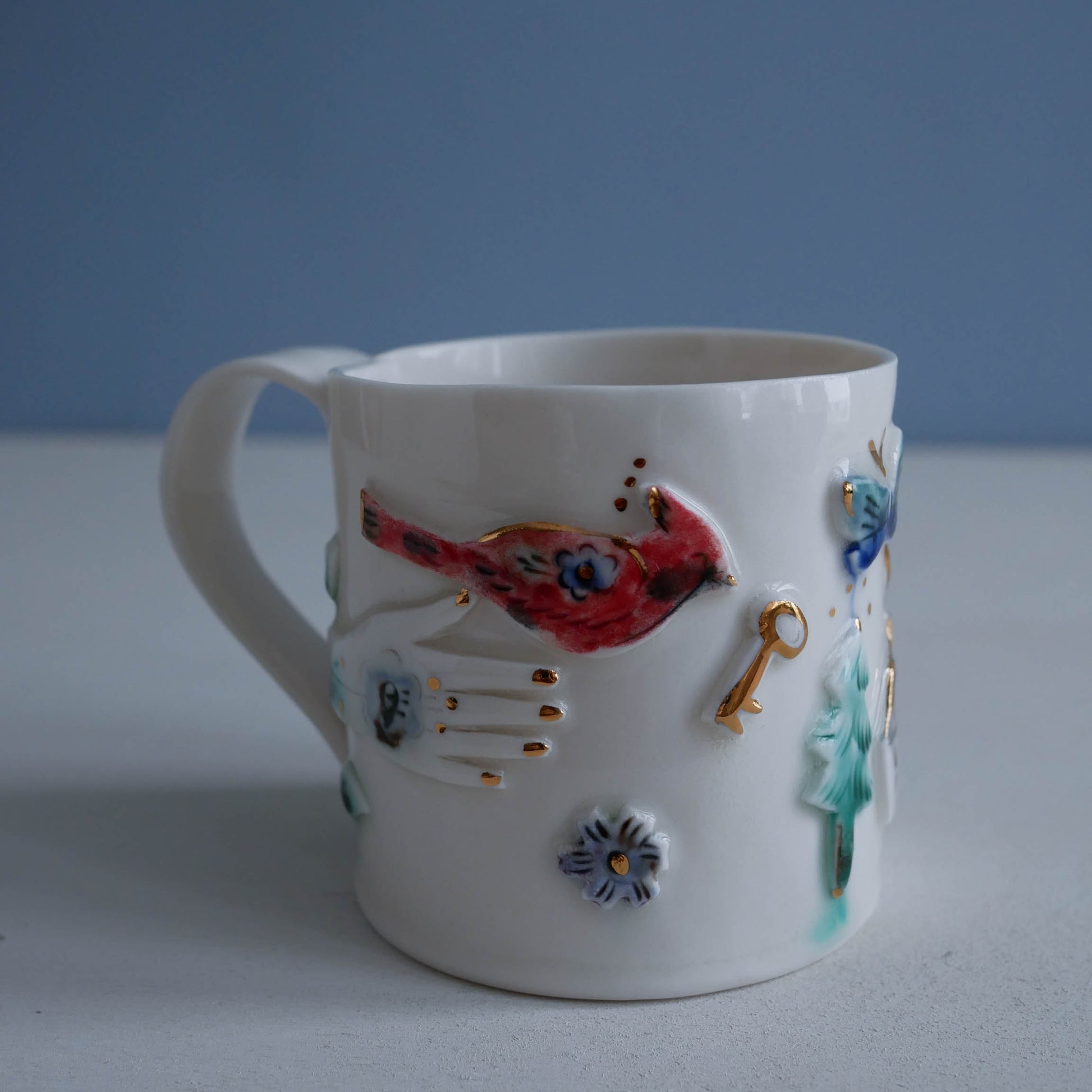 Hand formed porcelain mugs with hand cut applique designs & hand painted underglaze. Food safe clear glaze and then fired again with 22k gold luster.