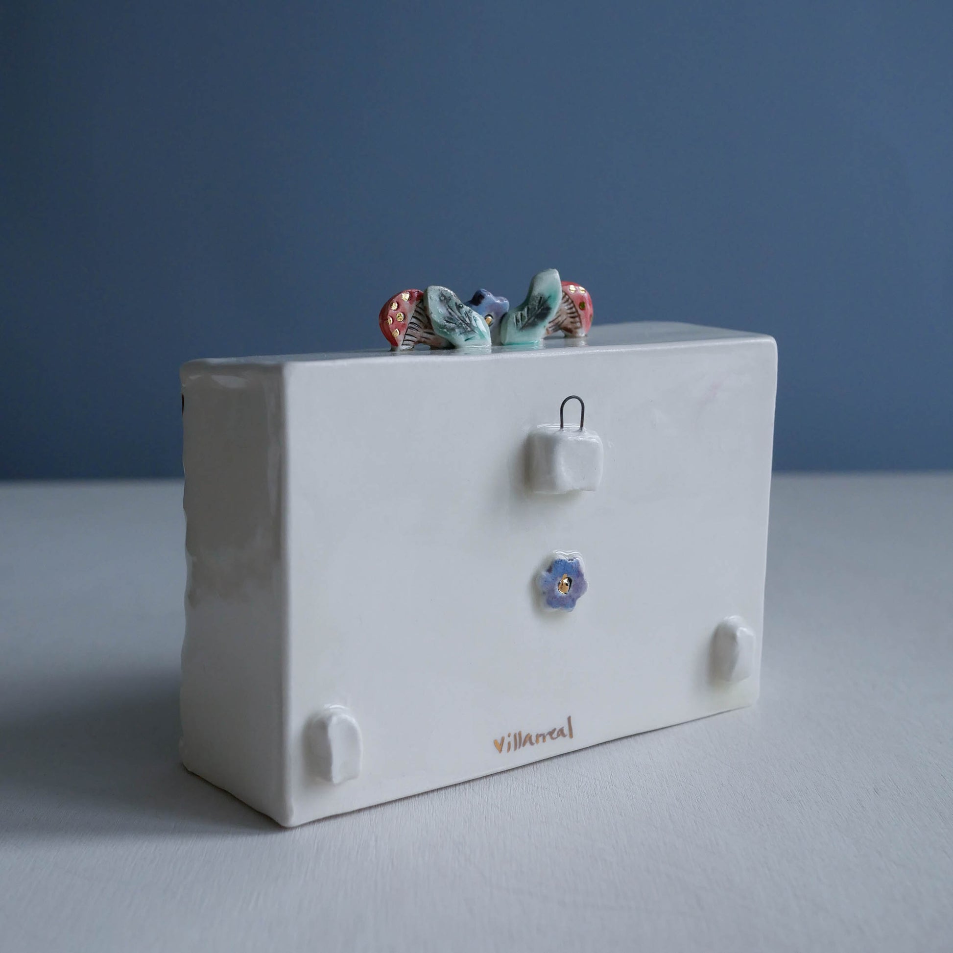 Each box is a small art piece. These little worlds are made from cut and collaged slabs of clay that I playfully arrange in boxes for a magical tender story to unfold.