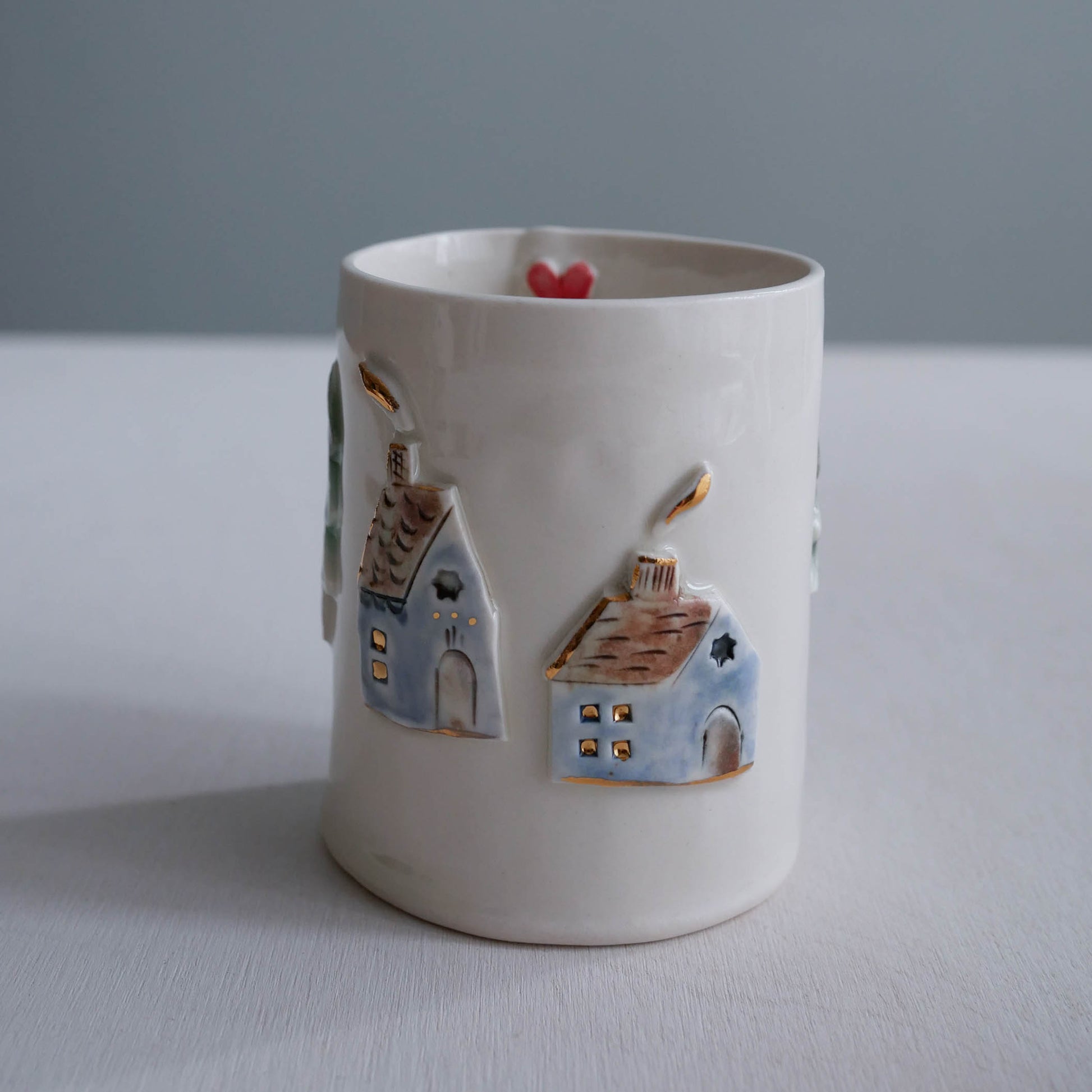 Sweet sippers. Handbuilt porcelain cup with applique designs. Hand formed, hand painted.