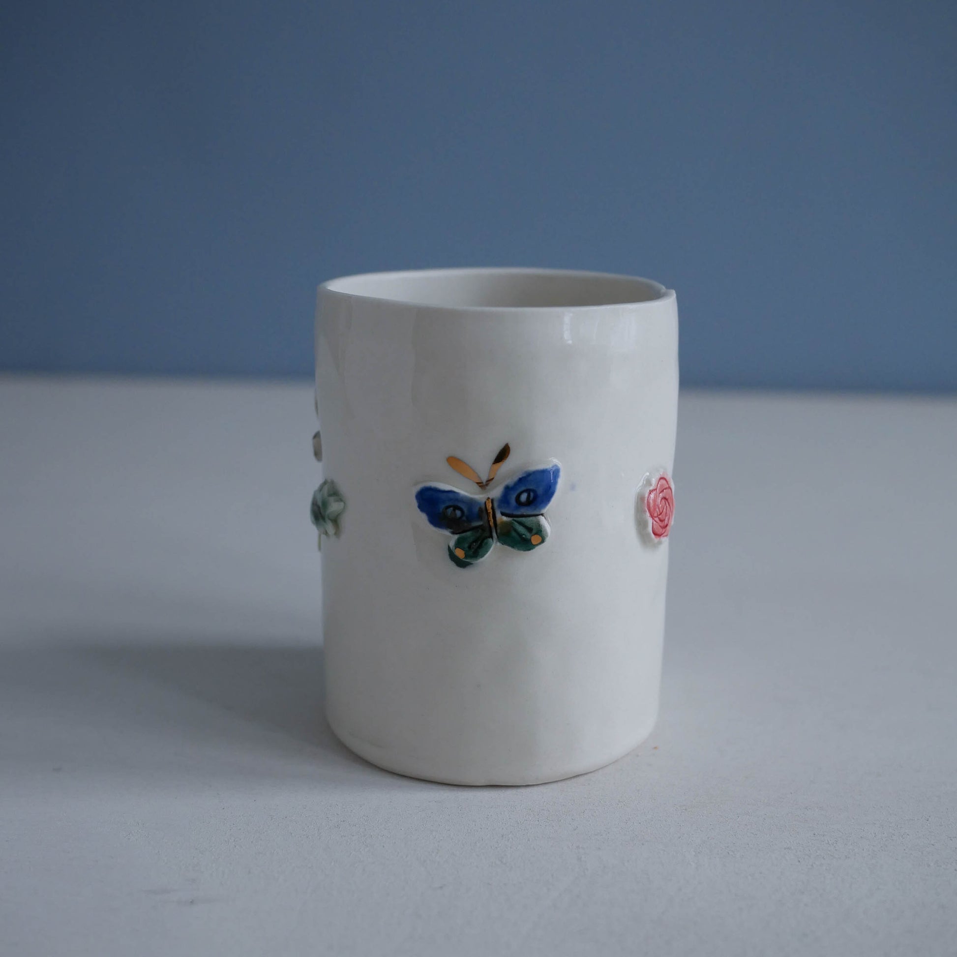 Sweet sippers. Handbuilt porcelain cup with applique designs. Hand formed, hand painted.