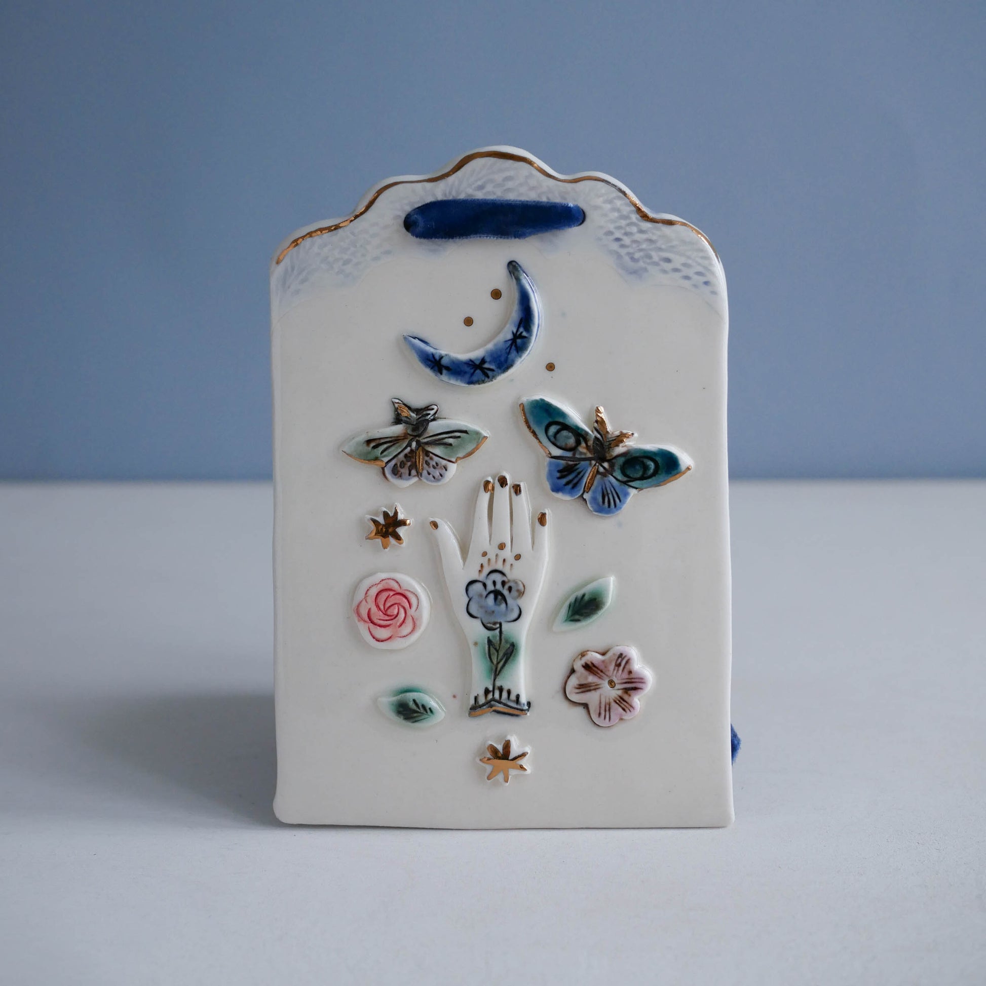 Whimsical tiles to decorate your wall. Each one is made by hand, each motif is cut from a thin slab of clay and attached to the tile. Hand painted with underglaze and oxides, glazed with gloss clear and fired a third time with 22k gold luster.
