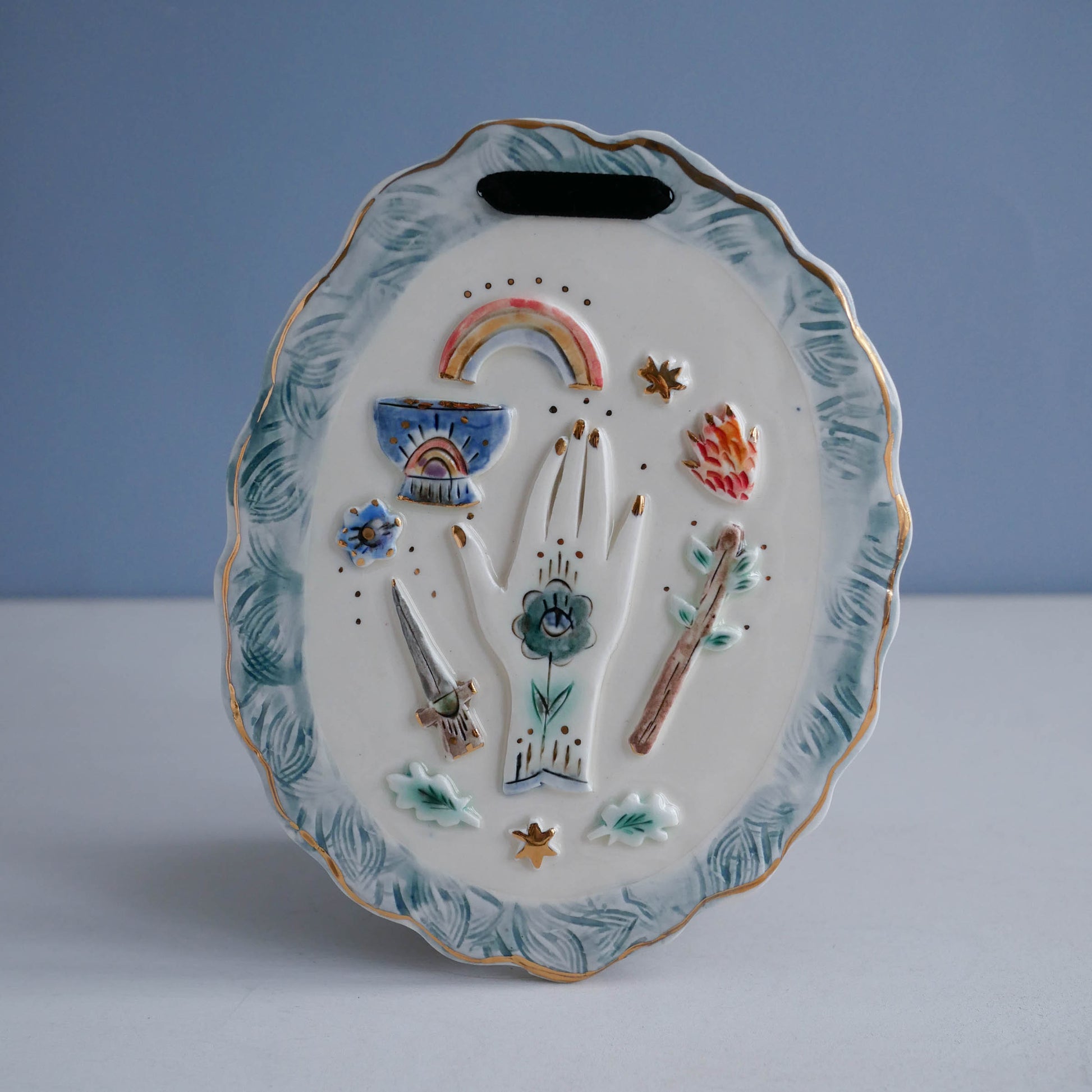 Whimsical tiles to decorate your wall. Each one is made by hand, each motif is cut from a thin slab of clay and attached to the tile. Hand painted with underglaze and oxides, glazed with gloss clear and fired a third time with 22k gold luster.