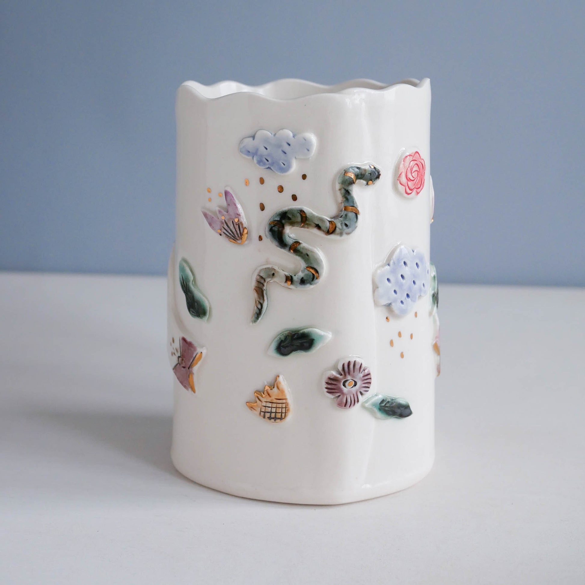 Hand formed and painted with soft colors and gold luster details. Hands hugging the form, flowers, gold, mushrooms.