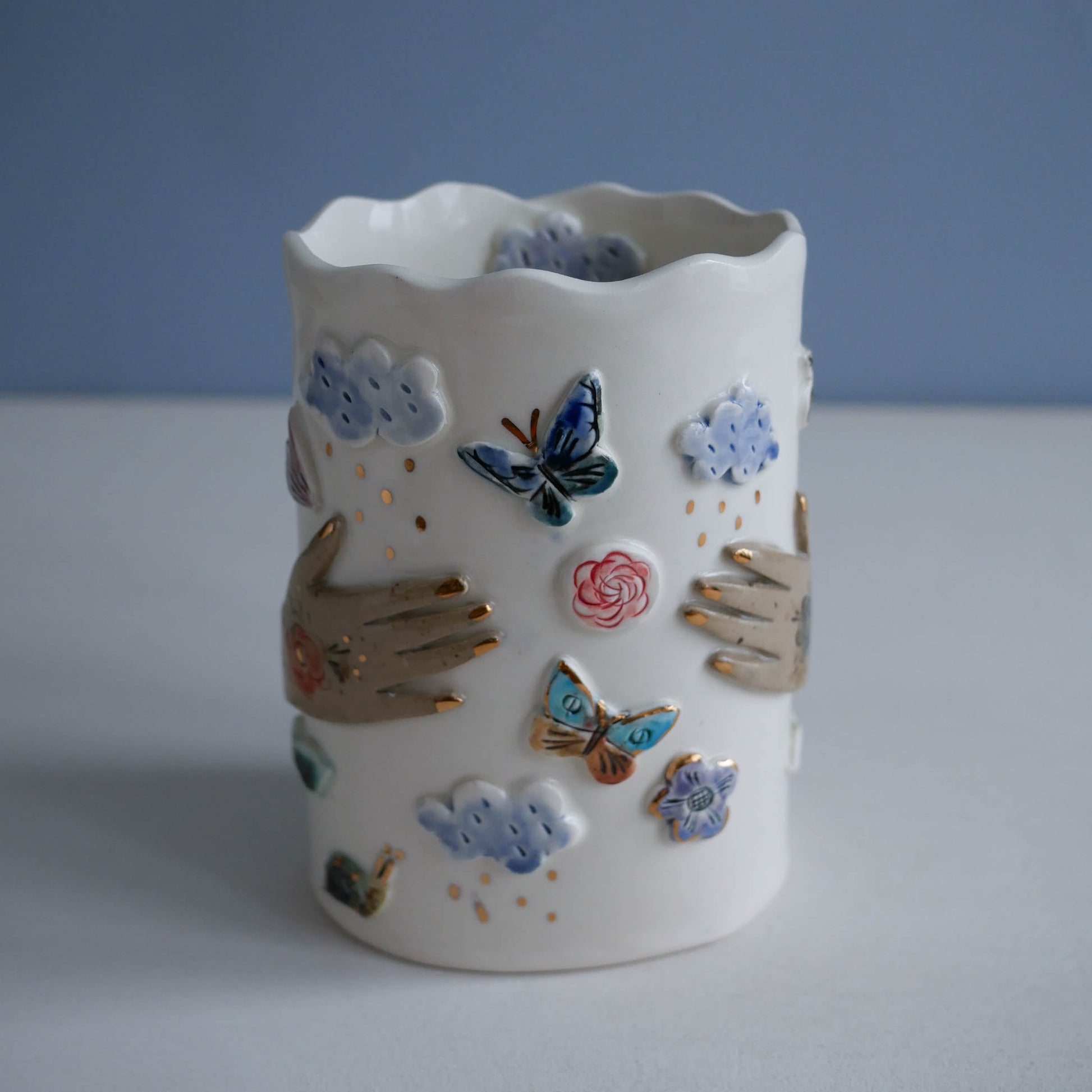 Hand formed and painted with soft colors and gold luster details. Hands hugging the form, flowers, gold, mushrooms.
