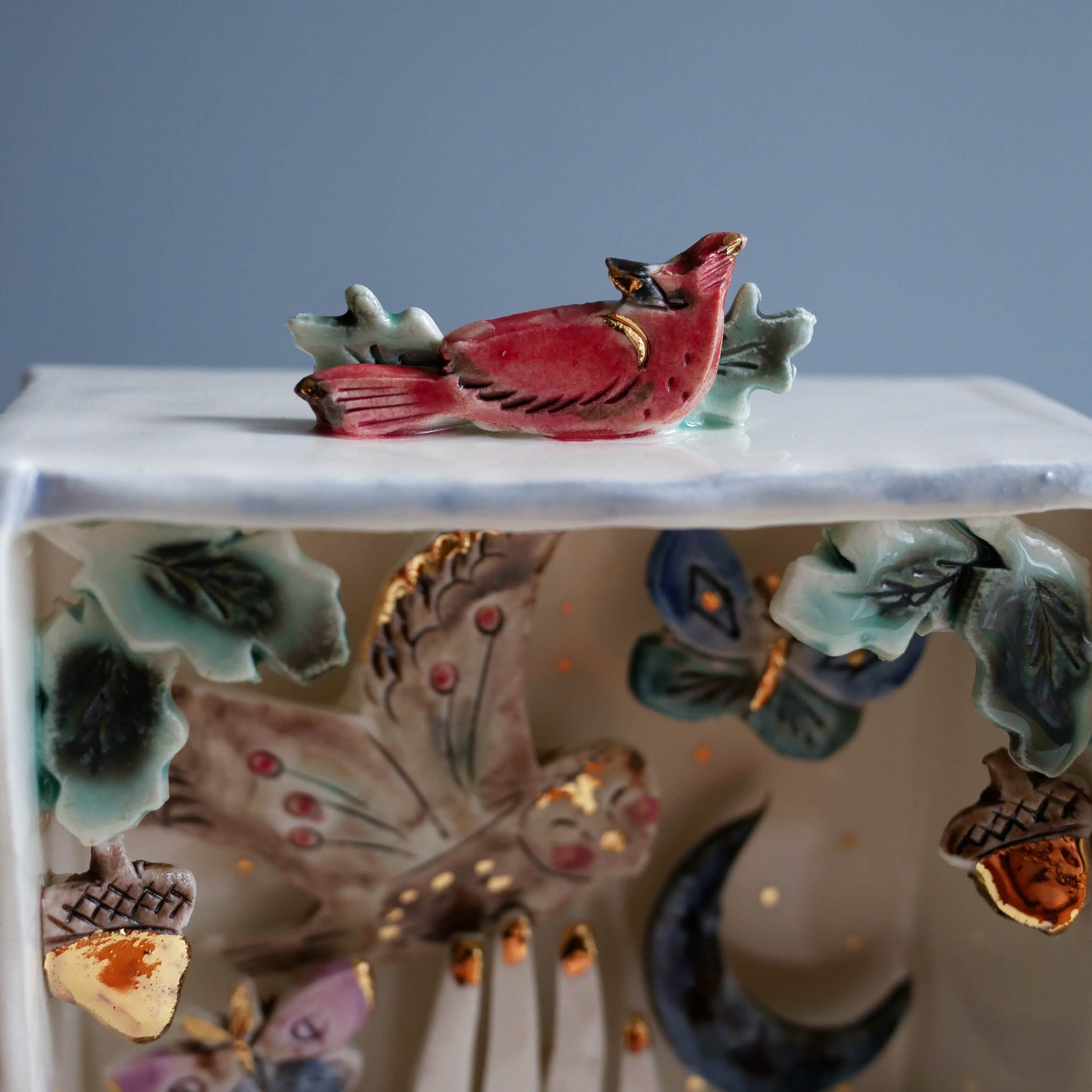 Each box is a small art piece. These little worlds are made from cut and collaged slabs of clay that I playfully arrange in boxes for a magical tender story to unfold.