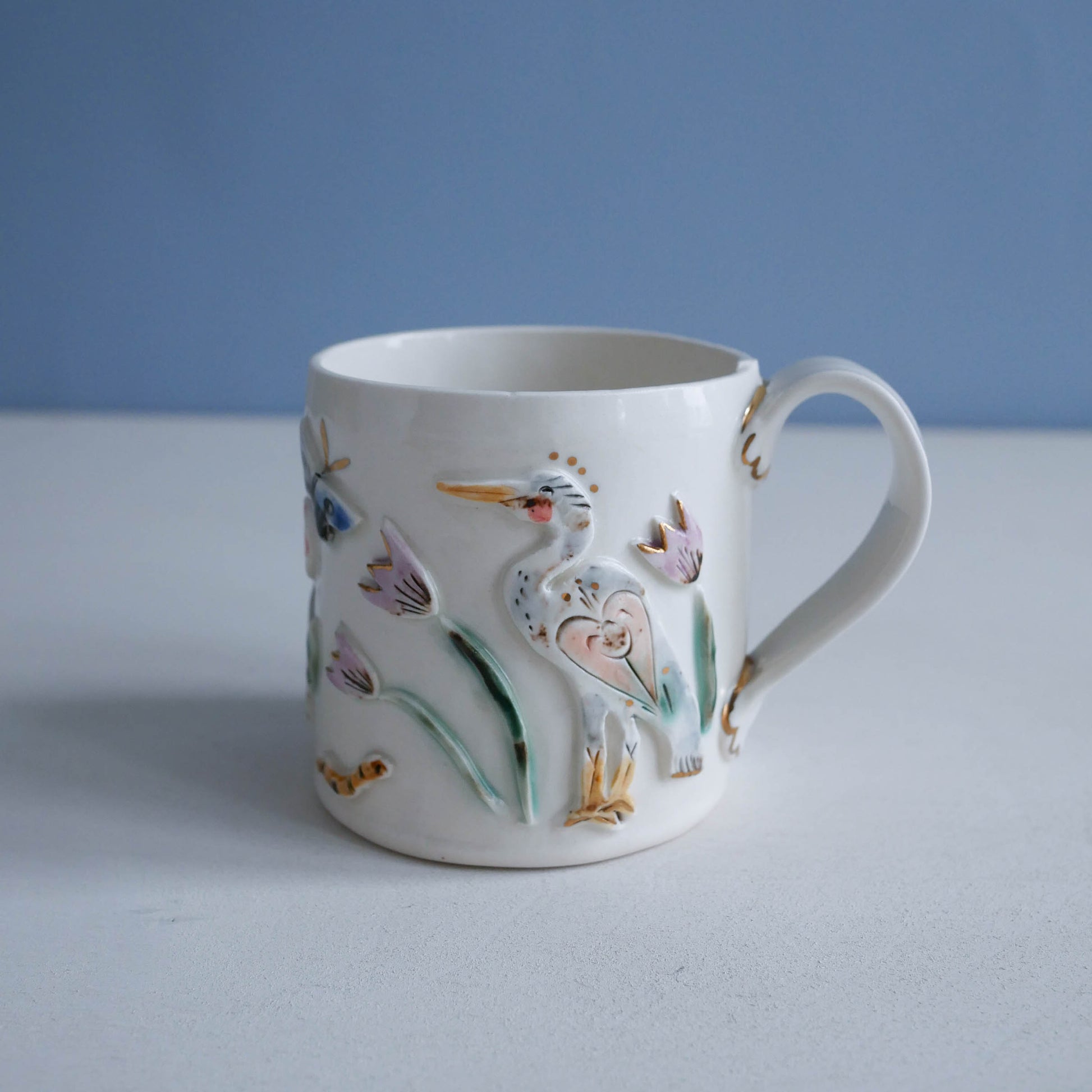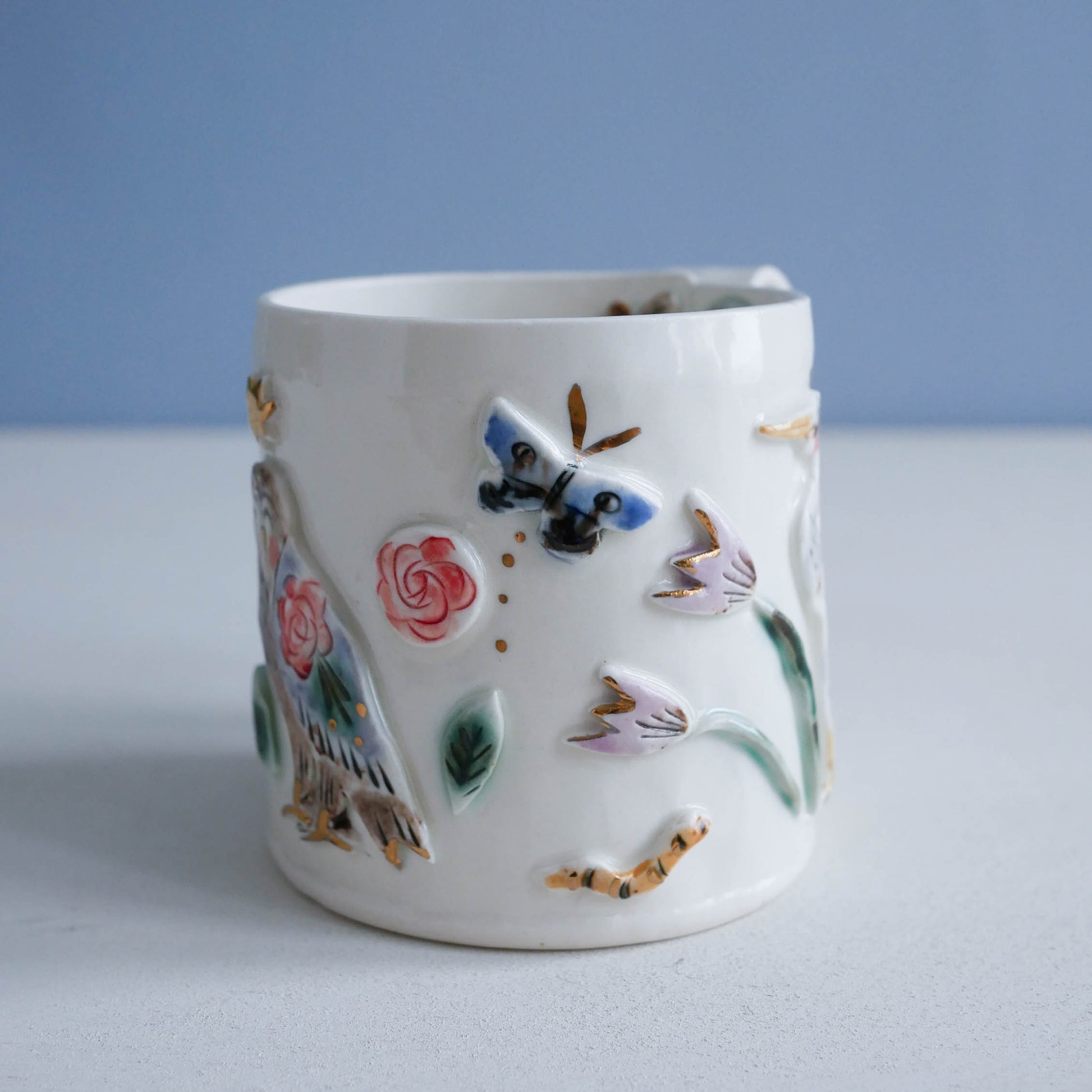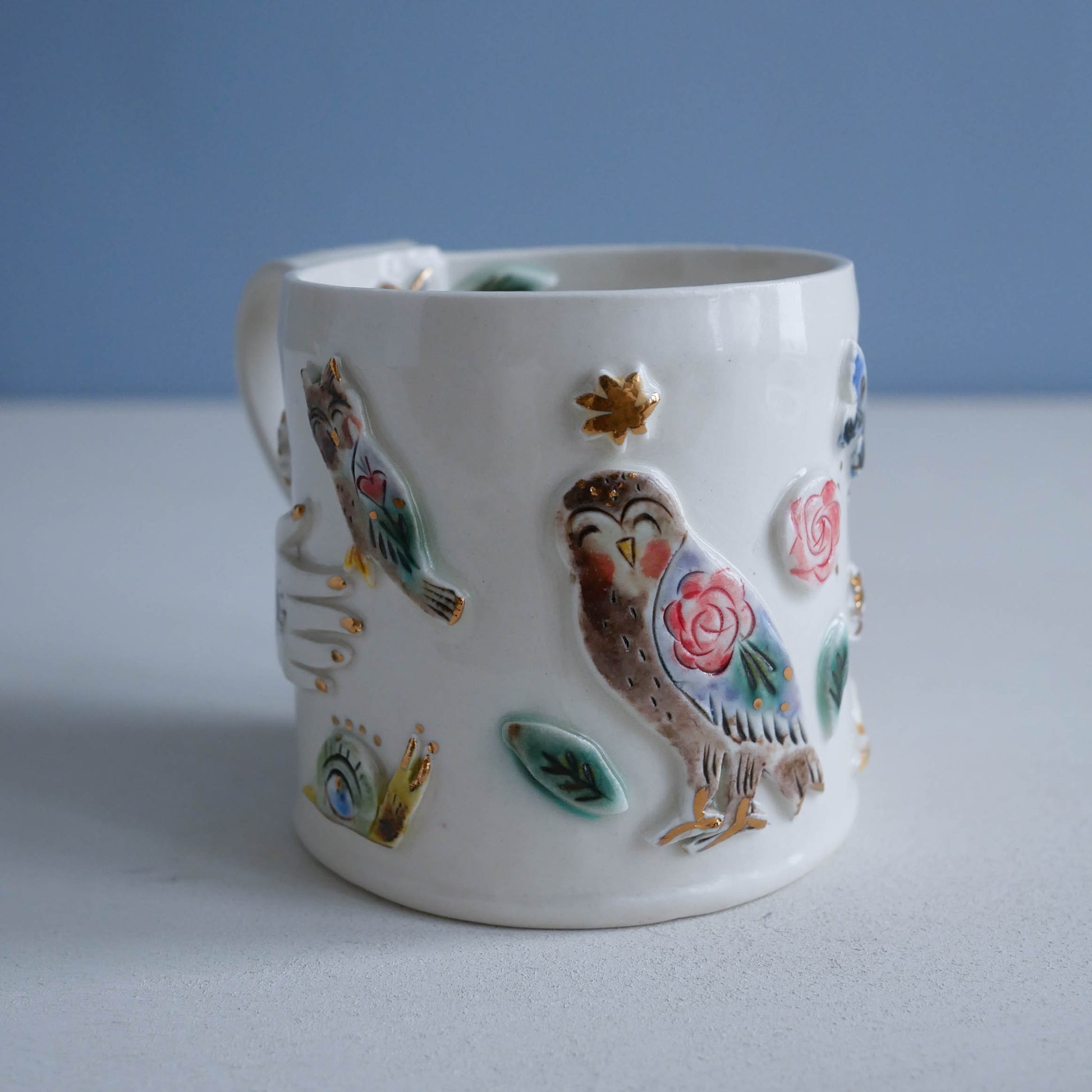 Hand formed porcelain mugs with hand cut applique designs & hand painted underglaze. Food safe clear glaze and then fired again with 22k gold luster.